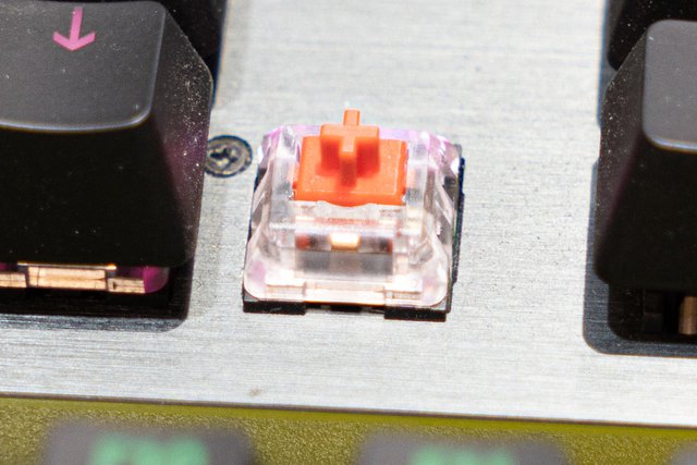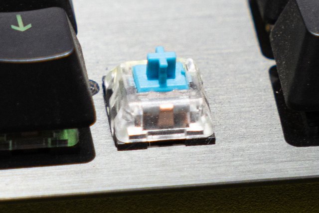 赤軸、茶軸、青軸の順でクリック感が強くなっていき、アクチュエーションポイントが分かりやすいため、キーを押せた瞬間も把握しやすい。一方でカチャカチャという打鍵音も大きくなる。クリック感があると気持ち良いが、ボイスチャットなどではうるさく感じられるかもしれない。好みにもよるが、環境が青軸を許さないという方もいるだろう。実際、赤軸が売れ筋らしい。
