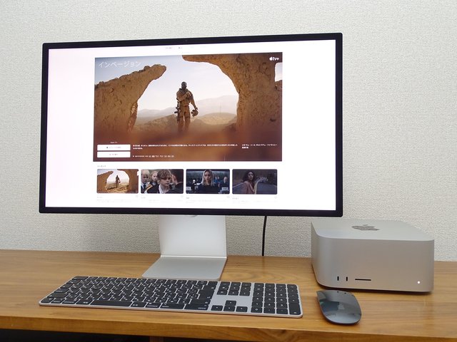 Studio Displayの大きな画面で視聴するApple TV+の映画のサウンド、Apple Musicのドルビーアトモスによる空間オーディオ楽曲は、とても豊かな包囲感が味わえる。MacBookシリーズよりも音のオブジェクトの定位感が鮮明で安定している。