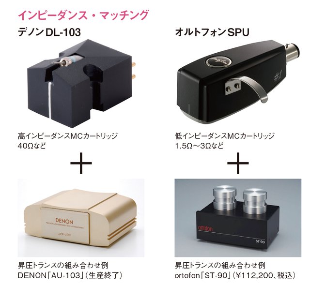 カートリッジのインピーダンスは、低いもの(オルトフォン「SPU」など)で約3Ω、高いもの(デノン「DL-103」など)で約40Ωある。少なくともそれ以上の数値を受けられる昇圧トランスを選びたい。