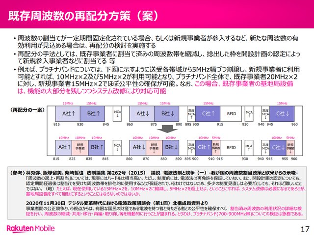 また楽天モバイルは現在、携帯3社に割り当てられているプラチナバンドの一部(800〜900MHz帯)から、同じ帯域幅ずつ再割り当てしてもらうという、少々面倒な要求をしています。仮にそれが実現した場合、3社との協議や対応が必要になるため、実際に使い始めるにはそれなりの時間がかかってしまうでしょうし、そうであれば、特定の1社が保有するプラチナバンドの再割り当てを求めた方が、相手が少なく使い始められるのも早いように思えてきます。