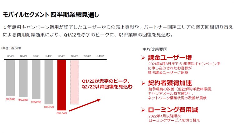 一方、楽天モバイルはそれだけ短期間のうちに大規模な投資をしていることから赤字幅が急拡大、楽天モバイルの親会社である楽天グループの経営にも大きな影響を与えるようになってきました。そこで楽天モバイルは、2022年第1四半期をピークとして楽天モバイルの赤字を縮小させる方針を打ち出し、当初から予定していた2023年度の黒字化実現に向け、収益確保を重視するようになってきました。