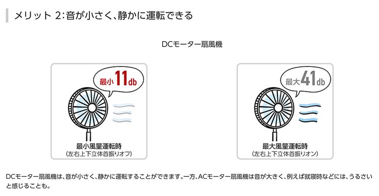 しかし、タネ明かしをすればとてもシンプルな話。モーターの構造をざっくりいうと、ACでは回転する部分(ローター)と固定されている部分(ステーター)の両方にコイルを設置し、そこに電気を流し磁気を発生させることで羽根の回転推進力を得ますが、DCではステーター側に電気不要の永久磁石を使用するため、そのぶん電力を節約できるのです。