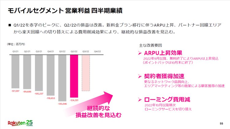 確かに月額0円廃止の影響などもあってか、楽天モバイルを主とした楽天グループのモバイルセグメントの営業利益を見ると、2022年4〜6月期の3ヶ月間の赤字は、同年1〜3月期と比べ赤字幅が減少している。新料金プランへと移行する次の3ヶ月には、課金対象のユーザーが増え、さらなる収益改善が期待されるのは確かだろう。