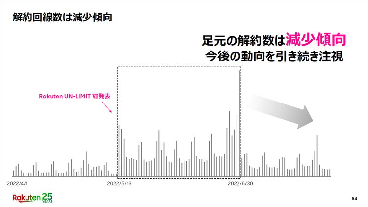 三木谷氏によると、解約数は月額0円廃止の発表後から大幅に増えたが、新料金プラン移行直前の6月末でピークを迎えており、足元の解約数は減少傾向にあることから、今後解約は落ち着くと見ているようだ。ただ、緩和策の終了まで顧客の動きは見えない部分もあるだけに、引き続き動向を注視する必要はあるとしている。