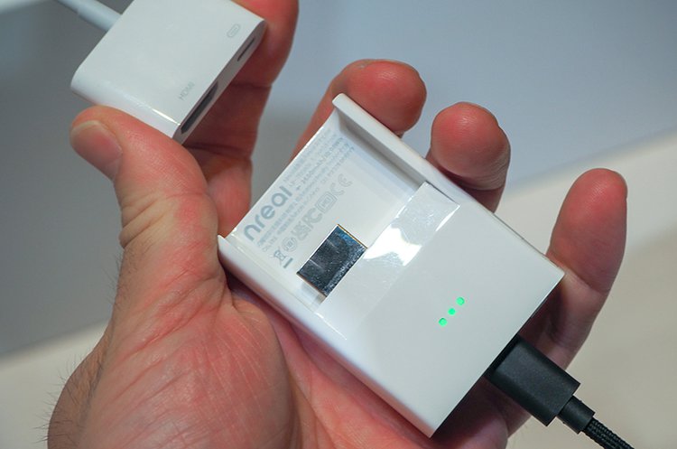 そんな中、同社が今回新たに発表したのが「Nreal Adapter」という周辺機器である。これは、HDMI端子に接続したデバイスの映像をNreal Airに出力できるようにするデバイスで、ゲーム機などさまざまな機器の映像を出力できることが特徴なのだが、最大のポイントはNreal AirをiPhoneで利用できるようにすることに主眼が置かれていること。実際Nreal Adapterは、アップルの「Lightning – Digital AVアダプタ」をぴったり装着できるサイズに設計されている。