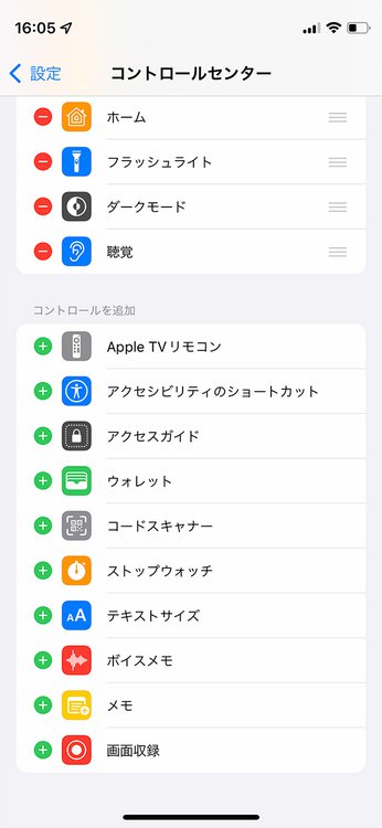 コントロールセンターに[聴覚]が出ていない場合には、[設定]アプリの[コントロールセンター]から[聴覚]をオンにして追加します。