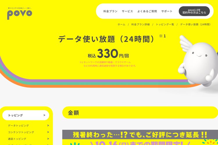 そこで検討したいのが「月々の基本料金ゼロ・使いたいときだけサービスを購入」するタイプの通信サービス。KDDIが運営する「povo 2.0」を例にすると、24時間データ使い放題のサービス(1回330円・税込)を購入すれば、どれだけストリーミングを聴いても通信料金は330円。月に3回長距離ドライブへ出かけるとしても、千円かからない計算です。