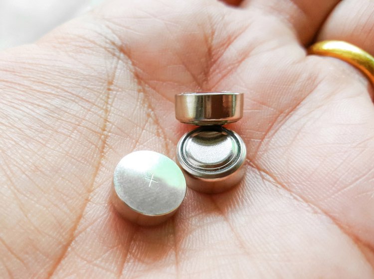 円筒形で直径より薄い乾電池、「ボタン電池」。より薄いタイプの「コイン電池」もありますが、両者を分ける基準は薄さではなく主要素材で、本邦メーカーの多くはアルカリ素材のものをボタン電池、リチウム素材のものをコイン電池と呼んでいます。