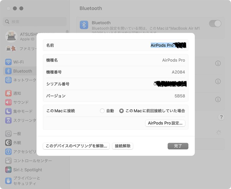 ●Mac:AirPodsをMacに接続して装着した状態で[システム設定]アプリ>[Bluetooth]に進み、AirPodsの横にある[オプション]ボタンをクリック>[このMacに接続]の設定を[自動]から[このMacに前回接続していた場合]に変更