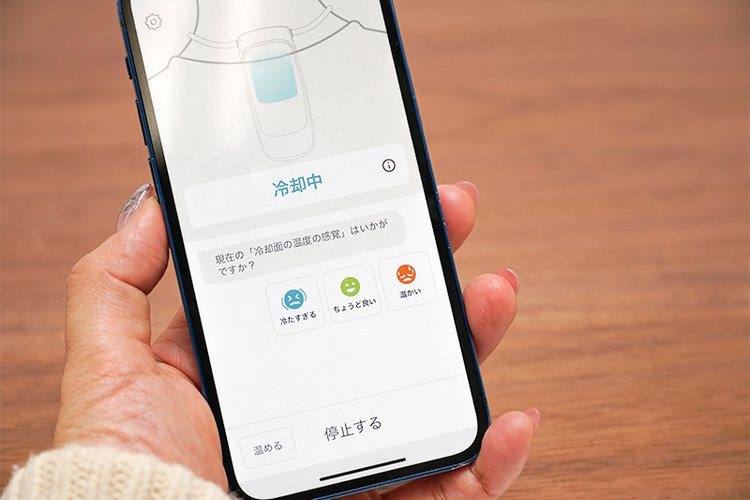 一方でアプリの使い勝手は大きく変化している。これまでのソフトウェアとは異なる仕組みを採っており、ユーザー自身で冷感レベルの設定をする必要はない。使い始めると、アプリから温度の感じ方について質問され、「冷たすぎる」「ちょうど良い」「温かい」の3つから回答を選択し、対話するような形でコントロールされる。