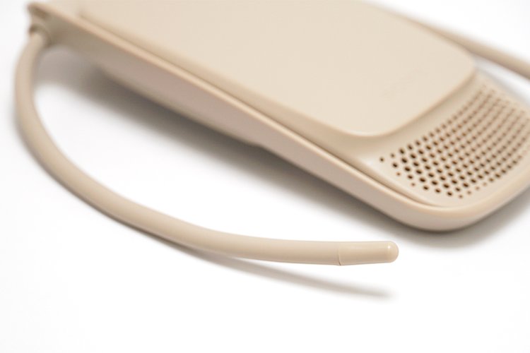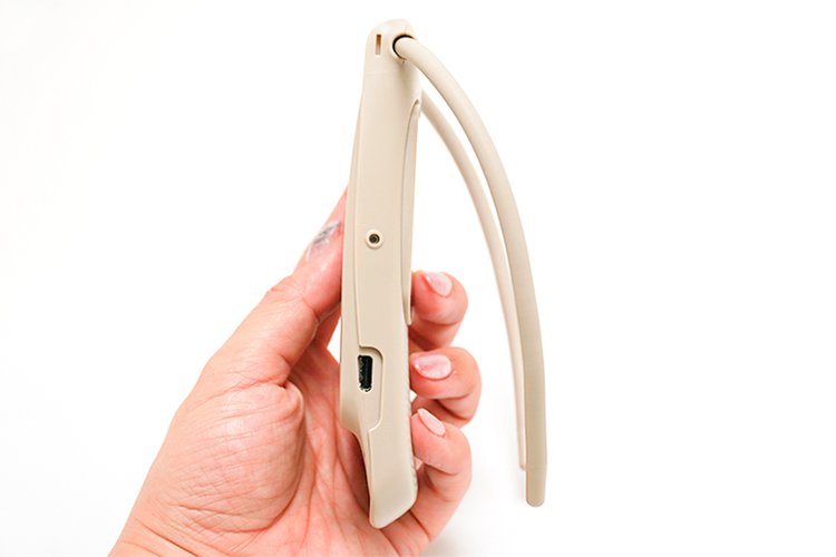 ネックバンドは細めながらも、表面は柔らかいシリコン素材になっている。首回りは29cmから35cmまで対応する。バンドの内部は3層構造で、シリコンの下にはワイヤーを軸に、フレキシブルに形状を固定できるチューブが用いられており、鎖骨部分に沿うようフォーミングされているという。また、自身で調整も可能だ。シリコンは肌あたりも優しい。