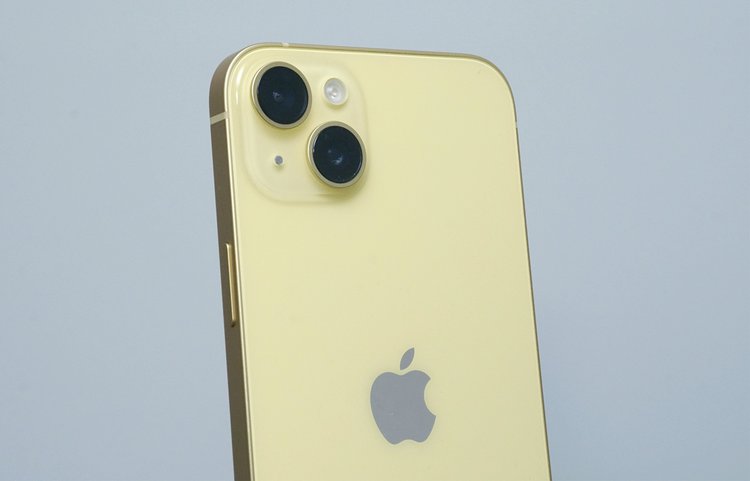イエローとひとくくりに言っても、いろいろな色合いがある。iPhone 14/14 Plusのイエローは、バックパネルについてはホワイトを混ぜたような、少し淡いパステルカラーのイエロー。サイドフレームは航空宇宙グレード7000系アルミニウム合金となっている。同じ素材のデュアルカメラのリングは金色に輝く。
