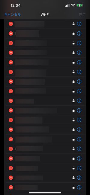 設定の右上にある「編集」を選択してロックを解除すると、画面には過去に接続したことのあるネットワークのリストが並ぶ。情報アイコンをタップすると、一部のネットワークについては上記と同じ手順でパスワードが調べられる。
