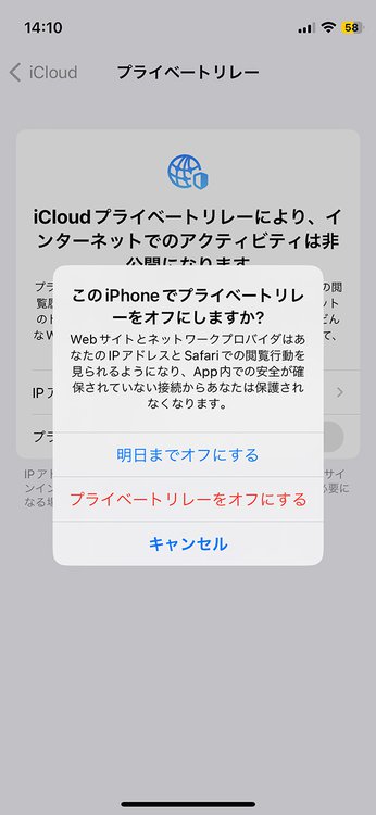 そういったトラブルに備え、「それまでは普通に使えていたウェブサイトの動作に支障が出たらプライベートリレーを一時的にオフにしてみる」という対応策も頭の隅に置いておきましょう。アップルもさすがというべきか、そういった場面でオフにしたプライベートリレーを翌日には自動でオンに戻してくれる、[明日までオフにする]オプションを用意してくれています。プライベートリレーが切りっぱなしになってしまう心配もありません。