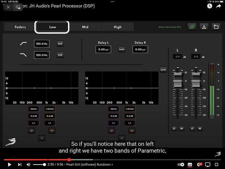 この黒いプロセッサ・ボックスは「Pearl Processor」と呼ばれていて、動画では「micro speaker management system」と紹介されている。「micro speaker」というのはイヤホンにおけるドライバーのことだ。そのマネージメントを行うシステムということになる。具体的になにを「マネージメント」できるかというと、その調整できる項目は、ゲイン、フェイズ(位相)、タイミング、イコライゼーションであり、それを高域・中域・低域に分けて調整ができるものらしい。
