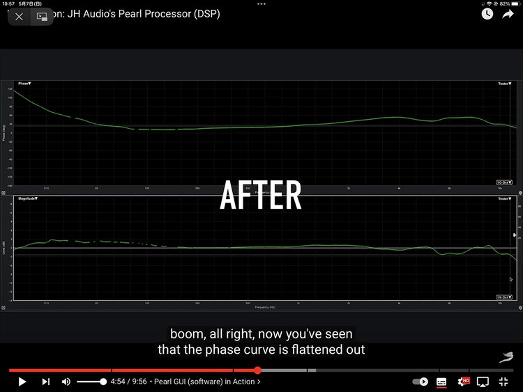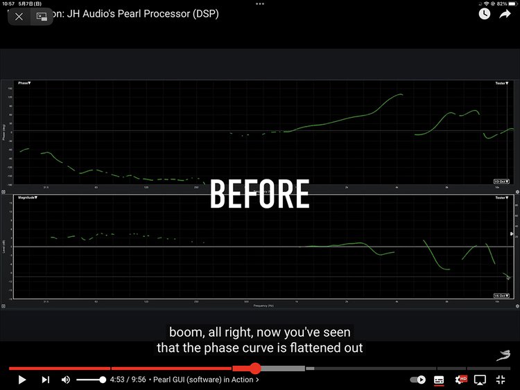 動画では4:54の付近からその調整前と調整後を比べることができる。これは特性をフラットにすることを目的にした調整作業で、グラフの上部分が位相、下部分が周波数特性を表している。調整前(BEFORE)では波打っていたものが、調整後(AFTER)ではきれいに調整されていることがわかる。また5:35付近から数分かけて実際にその調整の様子を細かく見ることができる。
