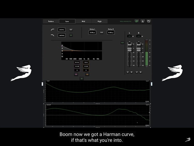 コンソールでは入力と低域、中域、高域別のスライダー(ゲイン)があり、それぞれのスライダーの下に位相とミュートのボタンがある。上部には低域、中域、高域のセレクターがあり、これで左右別のパラメトリックイコライザーが現れてハイパス・ローパスのスロープも調整できるようだ。