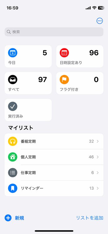 iPhoneのリマインダーにはiOS 16現在、実行済みリマインダーを自動で削除する機能がなぜかありません。しかも「毎週日曜日の19時30分から〇〇」のような繰り返しリマインダーも、その毎週分が別扱いで蓄積され続けます。毎日10個の繰り返しリマインダーを設定していたら、1週間で70個、1ヶ月で300個の実行済みリマインダーが蓄積されてしまうわけです。