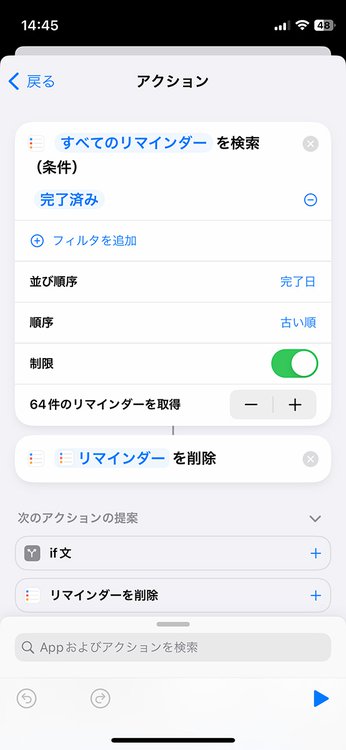 そこでおすすめは「ショートカット」アプリによるオートメーション化です。「毎日決まった時間に・[すべてのリマインダー]の中から[完了済み]を検索して・検索にヒットした[リマインダー]を削除」というオートメーションを設定して、その作業はiPhoneにお任せしちゃいましょう。