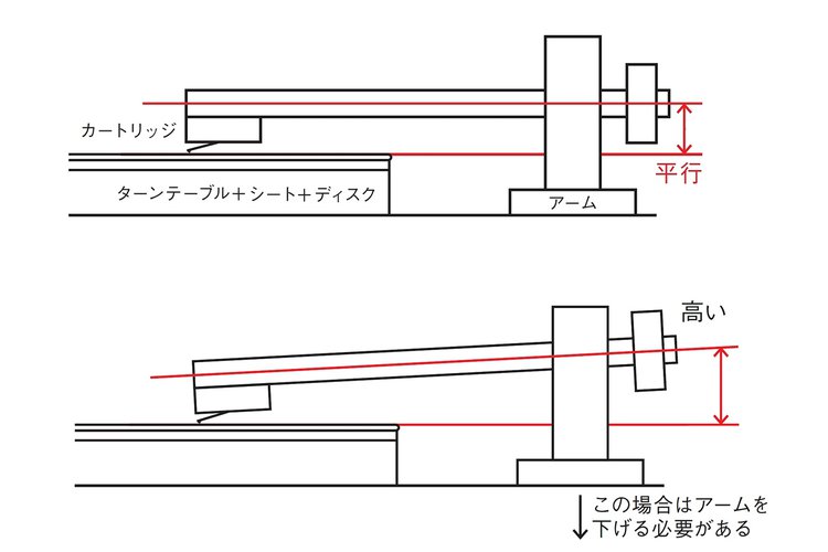 ゼロバランスが取れているかどうかは、基本的には自分の目で確認するしかない。ターンテーブルの上に定規を立てて水平を確認する方法などがあるものの、そこまで厳密さに拘らなくても大丈夫。ただ、どちらかといえば、カートリッジ側が上がってしまうのは良くないので(下がっている方がマシ)、そこは気をつけたい。