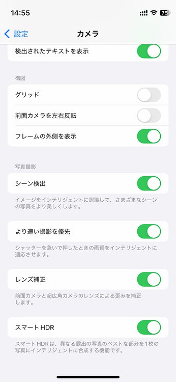 まあ、撮影後の写真を写真アプリの編集機能でさらに左右反転させることもできるので、この設定をどちらにしたとて取り返しはつきます。どちらも試してみて、自分にとって自然あるいは受け入れやすいと感じられるのはどちらなのかを探ってみるとよいでしょう。