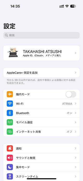 こちらはiPhoneの購入と同時、または購入日から30日以内においてのみ加入できる保証サービス「AppleCare+」「AppleCare+ 盗難・紛失プラン」への加入案内。iPhone 15シリーズ購入と同時にはAppleCare+に加入しなかった方の設定アプリに表示されているはずです。