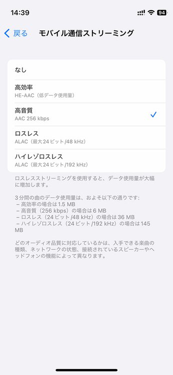 Apple Musicの場合は[設定]アプリ>[ミュージック]>[オーディオの品質]>[モバイル通信ストリーミング]を確認。最小の[高効率]から最大の[ハイレゾロスレス]まで順に、音質が向上する代わりにデータ通信量も増加します。なおWi-Fi接続時の設定は別項目となっており、ここでの設定はモバイル通信時にのみ適用されるものです。