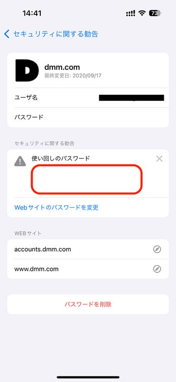 例えば「dmm.com」と「dmm.co.jp」のパスワードが保存されていると、お互いが使い回しとして検知され、両方に[このパスワードは‘"dmm.xx"のWebサイトで使い回しされています]の勧告が出ます。