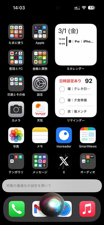 ですが我々にはそんなときこそ役立ってくれるアシスタントがいます。そう、Siriです。前述の例の場合、Siriを呼び出して「充電の最適化の設定を開いて」と音声で頼めば、[充電の最適化]項目を選択できる階層をいきなり開いてくれます。開きたい設定項目の名称を覚えておく必要はありますが、頻繁に使う設定ならその手間分以上の価値はあるはずです。