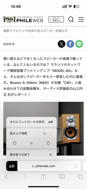 そんな方に一度試してみてほしいのが、iOS 17でSafariに追加された新機能「ページの読み上げを聞く」です。URLバー左側に表示されている[ぁあ]ボタンをタップして、メニューから[ページの読み上げを聞く]を選択。すると表示中のページの本文テキストが合成音声で読み上げ再生されます。
