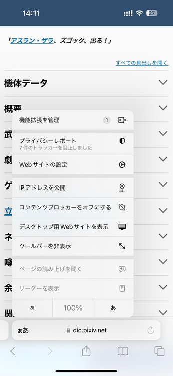 ただし利用時に一手間が必要なサイトもあります。例えば冒頭で挙げたピクシブ百科事典の収録内容が長めなページは、ページ訪問時には本文各パートが「機体データ」「概要」「武装」などの見出しのみの状態に折り畳まれていて、見出しをタップすることで本文が展開されるという表示スタイル。その「本文が折り畳まれた状態」では読み上げ機能はうまく働かないことが多いのです。