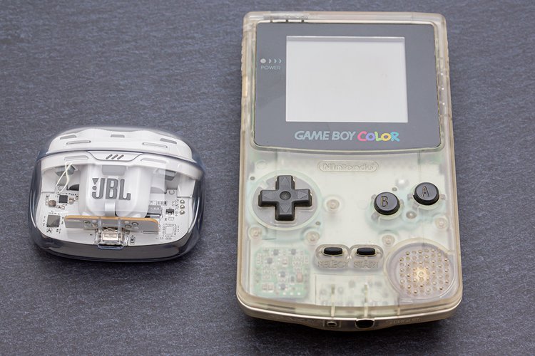企画記事では4モデルものスケルトン完全ワイヤレスが横並びで紹介されていたが、本稿ではJBLの「TUNE BEAM GHOST」(ホワイト)を迷うことなくチョイス。決め手は何といってもケースやステムから内部基板が覗けるほどのスケルトンぶり。「これだよ!これ!」といわんばかりにスケルトン欲が満たされ、一瞬で “あの頃” に還れる。記者が持ち出したゲームボーイカラーと並べれば「組み合わせてください」と聴こえてくるほどのマッチング。ブランドとしては「Y2K」を意識したカラーなのかもしれないが、本モデルの企画担当者はきっと “あの頃” スケルトンに脳を灼かれた側の人間に違いない。
