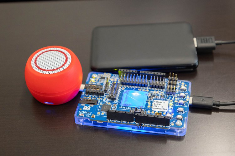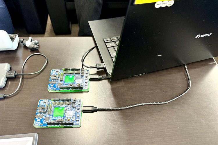 今回のシステムは、東芝情報システムが近年EdgeTech+ イベントに出展しているもので、システムの目的はスピーチの同時通訳を会場にいる多数のゲストが装着しているイヤホンにブロードキャストで届けるというものだ。ハードウェアとしてはNordic社の「nRF5340DK」評価ボードを採用している。これはいわゆるマイコンボードであり、nRF5340チップはARM-CoretexをベースとしてBluetooth5.4をサポートするワイヤレスSoCだ。そのソフトウェアを東芝情報システムがプログラミングして組み込みのソリューションとしている。