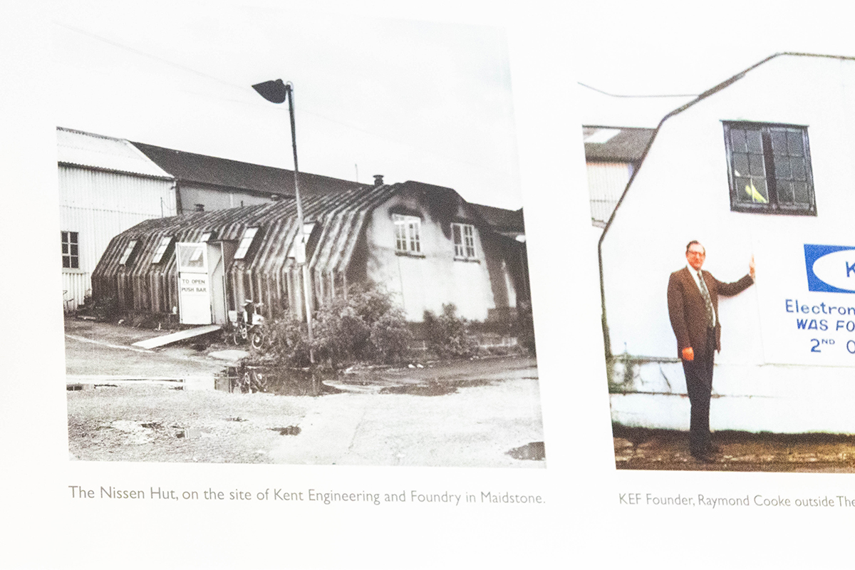 社名は「Kent Engineering and Foundry」という名の金属加工工場に由来する。工場敷地内にニッセンハット(「プレハブ小屋」の意味)を建てて創業者レイモンド・クックがKEFを立ち上げたのが1961年のこと。ガレージのような小さな工場からスタートしたオーディオメーカーは他にもあるが、同じ地で60年以上も操業している例はさすがに少ないと思う。ショウルームには手間をかけて作られたニッセンハットの模型が展示してあり、創業者への思いが伝わる。現存する煉瓦作りの建物は見慣れたモノクローム写真そのままで、初めて来たのになぜか懐かしさを感じた。