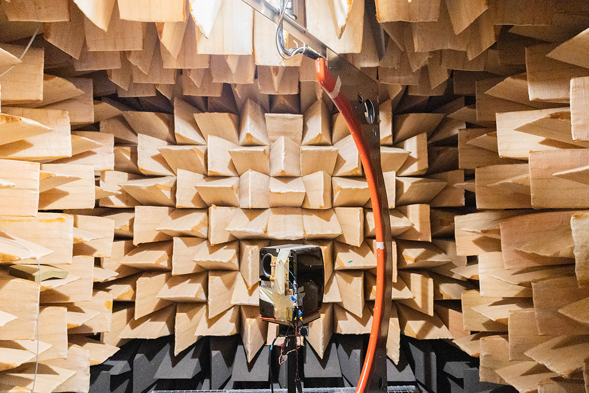 生産部門に隣接して無響室があり、水平と垂直方向の周波数特性をきめ細かく測定する装置が稼働している様子を見学することができた。そのほかにも天井の高い広大な測定ルームがあり、大型スピーカーを含む多様な製品群の開発に活用しているという。