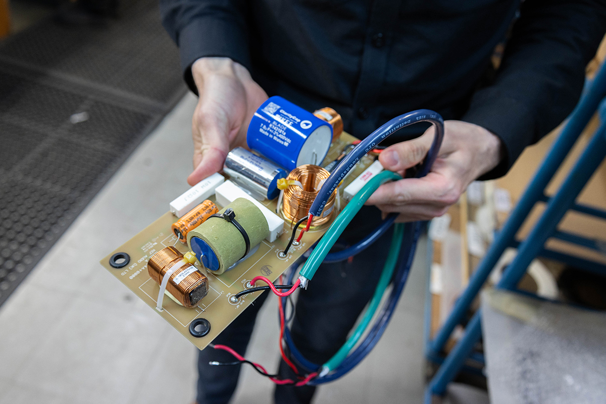 生産部門では、少人数の熟練スタッフが複数のプロセスを受け持つ形でスピーカーを作り上げる手法を採用している。ドライバーユニットの取り付け、ネットワーク回路の組立てとキャビネットへの実装、そして最終仕上げから検査に至るまで、各工程にじっくり時間をかけてハンドメイドで作り上げる