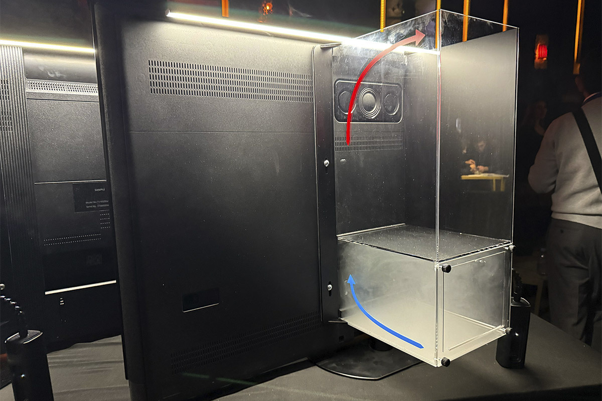 自発光する有機ELパネルと映像処理を担うプロセッサー「HCX PRO AI MKII」が、視聴時に発する熱を、効率よく逃がすための冷却構造も改良。本体背面の中心部に鎮座していたウーファーユニットをトップ側にレイアウトし直し、さらに熱を逃がすための空気の通り道を引き直した。このことによりテレビの発熱を下げ、映像制御の安定感を高める効果が一挙に得られるという。