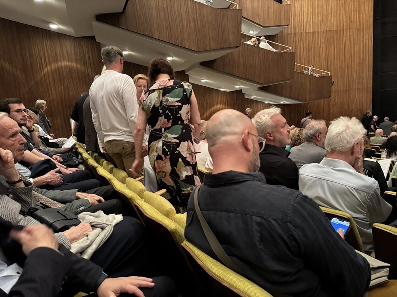 あれ、今いた後方にあるホワイエがなんで舞台上にあるわけ?合唱の男女は、ちょうど観客のように美しく着飾ってシャンパンなどを飲んでおり、そのなかにジークリートとブリュンヒルデだけが古い時代の衣装をまとって登場する。この演出は、時間や空間感覚の惑いや、現実と演劇空間の交錯をもたらすが、それがなぜか心地よい。ここは完全に演出家にしてやられたなあ、と脱帽した。