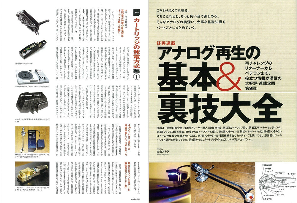 再チャレンジのリターナーからベテランまで、役立つ情報が満載の好評連載企画。「こだわらなくても鳴る。でも、こだわると、もっと良い音で楽しめる」そんなアナログの奥深い、大事な基礎知識をパートごとにまとめていく企画です。第9回からは、カートリッジの発電方式を取り上げます。
