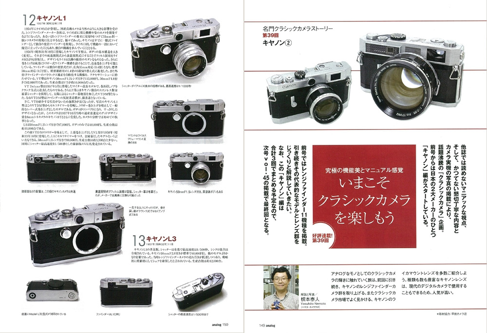 他誌では読めないマニアックな視点と懇切丁寧な内容、実際のカメラの写真を掲載して大好評の「クラッシックカメラ企画」。今回は、日本の大メーカーのひとつ、「キヤノン」の2回目。レンジファインダー11機種とレンズ群を掲載。