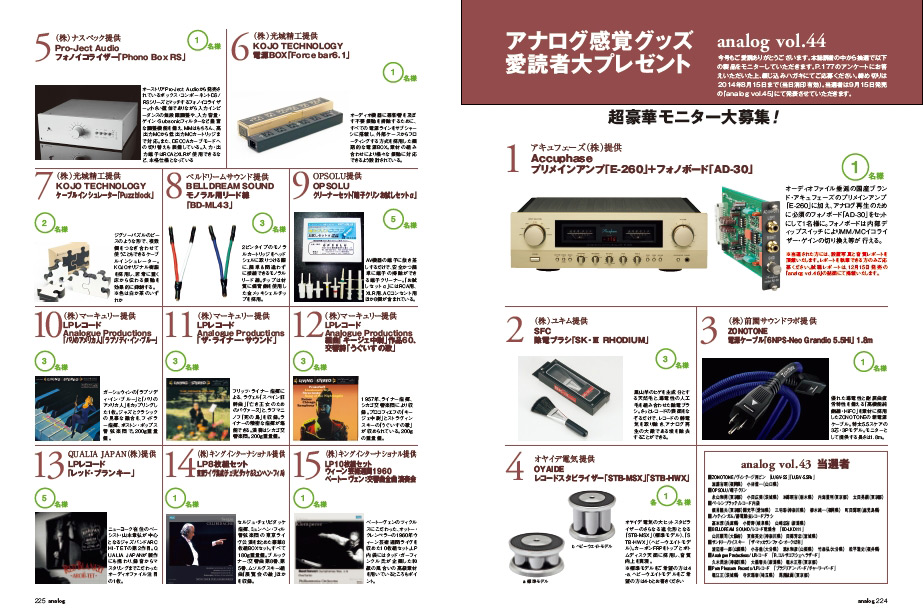 今回の号では、特別企画「アナログ関連 超豪華モニター大募集」を実施しています。アキュフェーズの高級プリメインアンプ、多機能フォノイコライザーを含めて、アナログレコード再生をさらに楽しめる魅力のハード/アクセサリー/ソフト製品、合計15アイテム34名様分のモニタープレゼント企画を実施いたします。綴じ込みハガキにアンケートを記入の上、ふるってご応募下さい(詳細は当ページの最後をご覧下さい)。