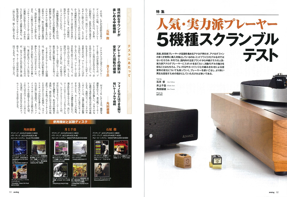 高級、超高級プレーヤーが話題を集める昨今、アナログファンの多くが実際に購入対象としているのは、ミッドプライスモデルといえるのではないでしょうか。今号では、国内外の注目ブランドから、中級クラスの人気・実力派アナログプレーヤーにスポットを当てました。対象モデルの魅力を探ることはもちろん、フォノイコライザーやカートリッジとの組み合わせによる音質の違いなど、新たな魅力を探り出す"使いこなしの楽しみ"も探っています。