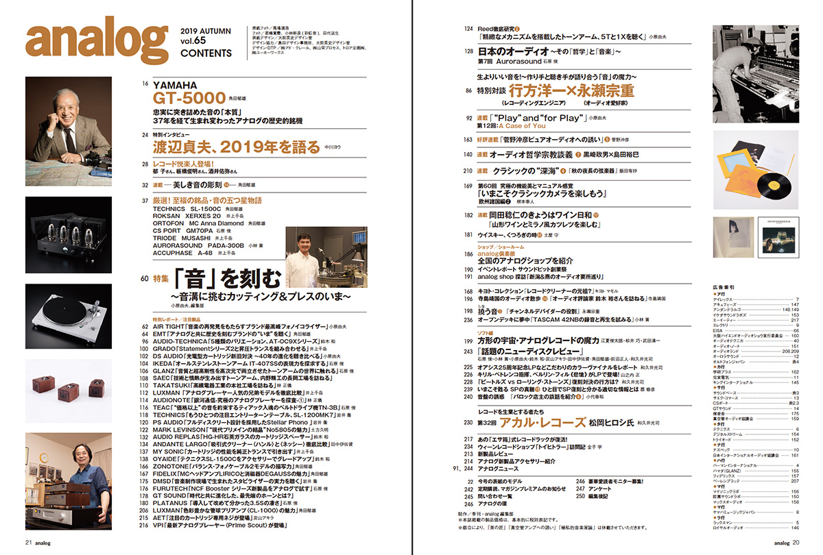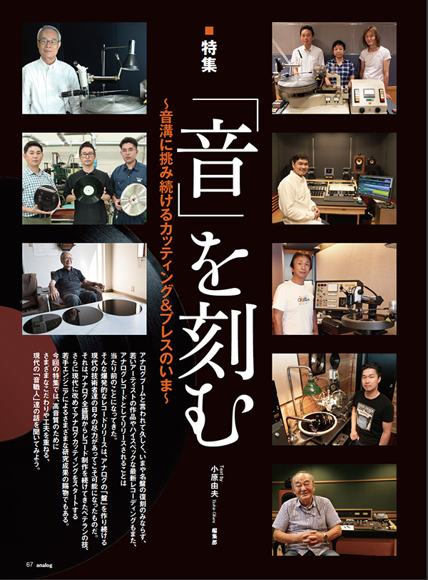 そこで今回は、改めて「なぜ、アナログなのか」をテーマとして、レコードに刻まれる「音」にまつわる物語をより一層充実してお届けして参ります。 第一特集はレコードカッティングやプレスのいまに迫る『「音」を刻む』。昨今のその生産枚数も右肩上がりに増え続け、日本国内でも続々と生産されるレコードについて各社のキーパーソンがその想いを語るインタビューを掲載。また、レコーディング・エンジニアとして数々の名作に携わった行方洋一氏とマニアの間でその名を轟かせるオーディオ愛好家、永瀬宗重氏が対談形式にて作り手と聴き手、それぞれの目線からオーディオ、そして良い音で楽しむ音楽の魅力を紐解いて参ります。 もちろん、注目製品のレポートも必見! さらにクラシックカメラからお酒まで、今号も「アナログ感覚」満載にてお届けいたします。