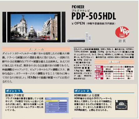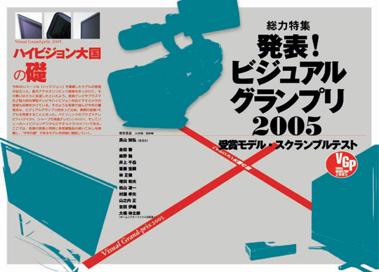 12月号誌面紹介 発表! ビジュアルグランプリ2005 受賞モデルスクランブルテスト 年に1回のビックイベント、ビジュアルグランプリ2005が決定しました。既にこのサイトで結果を発表していますが、今年の金賞はパナソニックのプラズマテレビ・TH-42PX300、ソニーのハイビジョンビデオカメラ・HDR-FX1、シャープの液晶テレビ・LC-45GD1に決まりました。3モデルの受賞はこれまでに例がなく、それだけにこれらの優秀性が際立っていたと言えるでしょう。いつもなら、この時期のAVレビューは発表だけで終わっていましたが、今年はさらにテストレポートも併せて紹介しています。全54ページ・ビジュアルグランプリ一色、たっぷりと堪能してください。