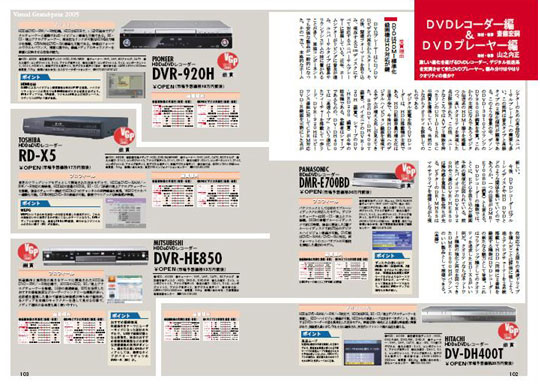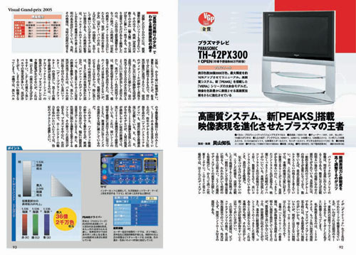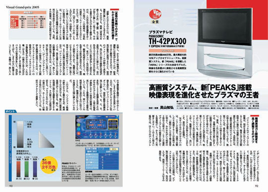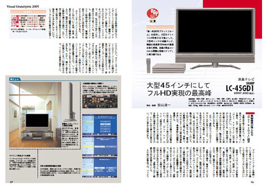 テストレポートの誌面要素はクオリティをイメージしてもらうための画質・音質傾向表に加え、各製品を使う上でのポイントをピックアップしています。極端な話、文章を読まなくてもすぐに判断できるような製品評を目指したというところです。金賞モデル編、薄型テレビ編、DVDレコーダー&DVDプレーヤー編、プロジェクター編、AVアンプ編、スピーカー編、DVC編で構成していきました。