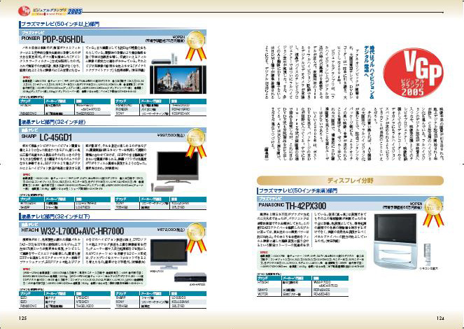 皆さんお待ちかねのプレゼントは、なんとハイビジョン録画が可能な2モデルを用意しました。パナソニックのブルーレイディスクレコーダーDMR-E700BDとパイオニアのDVDレコーダーDVR-920Hです。DMR-E700BDは世界で初めて50GBのブルーレイディスク記録を可能にしたモデルで、BSデジタルのハイビジョン番組を約4.5時間収録することができます。これでほとんどの映画は1枚におさめられますので、ハイクオリティな状態でコレクションしたい映画ファンには欠かせないモデルと言えるでしょう。また、DVR-920Hはパイオニア製レコーダーのトップエンド機で、CPRM対応DVD-Rの録画が可能な点や「気がきく!録画辞典」を採用して、EPGの検索機能を大幅に向上させた魅力あるモデルです。当選者は2名だけ、2005年をハイビジョン録画で楽しみましょう!! パナソニック ブルーレイディスクレコーダー DMR-E700BD パイオニア HDD&DVDレコーダー DVR-920H デジタルディスクレコーダー・パーフェクトファイル2005 Winter DVDレコーダーをまとめた記事をやってほしいという声を受けて、AVレビュー別冊「DVD RECORDER」を3冊刊行してきました。その時期に発売されている現行製品は当然のこと、昔のモデルも掲載し、DVDレコーダーのことならこの1冊ですべてがわかるというコンセプトで作った本です。今号の特集はこのテイストを受け継ぐ記事に仕上げています。但し、背景的に異なるのはブルーレイディスクレコーダーや一部のDVDレコーダー(HDD部)にハイビジョン記録を可能にした製品が増えてきたことです。従って、DVDレコーダーのみならずデジタルディスクレコーダー全般の購入ガイドを目指しました。 <第2特集> 発表! ビジュアルグランプリ&オーディオ銘機賞 ジャンルトップ賞総覧 10月25日に年間優秀AV製品を選出するビジュアルグランプリ2005審査会を開催。このサイトや12月号(11月17日刊行)でさまざまな賞を発表しましたが、ここでは最後に残されたトップ賞の発表です。これはプラズマテレビ、液晶テレビ、プロジェクター、DVDレコーダーなど、ジャンル別の優秀製品を審査委員12名とビジュアルグランプリ審査協力販売店(62店)の得票数を合計して選んでいます。まさに現在のヒットモデル、これからヒットするモデルのオンパレードです。 <SPECIAL NEW PRODUCTS>&<新製品FLASH>