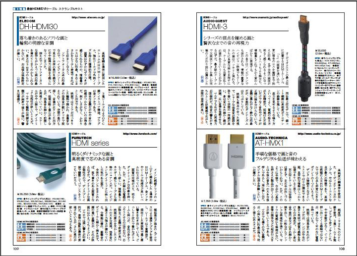 HDMIとDVIは基本的に1本のケーブルで映像のデジタル伝送を行う端子です。前者は規格的に音声も通せるのですが、まだ対応製品が限定されているのが実情です。とはいうもののケーブルのラインナップは多くなりました。ここでは23本をとりあげて画質面、音質面におけるレポートを行っています。実は所有機器が対応していた、なんてこともあるでしょうから確認してみてください。AVレビュー久々のケーブル特集です!! <SPECIAL NEW PRODUCTS>&<新製品FLASH>