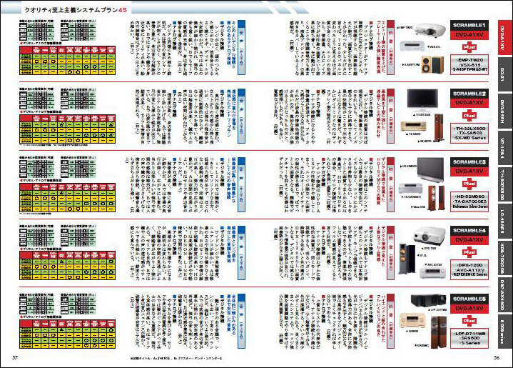 あるAV製品を手に入れると、もっと潜在能力を発揮させようと、映像系や音声系のシステムを変えたくなることはありませんか。ここではそのようなクオリティを重視したシステムプランを編集部で提案。核となる製品と組み合わせて、画質・音質傾向を探っています。また、接続方法もクオリティを左右する重要なポイントですから、アナログ/デジタルの接続における違いにも着目してみました。総システム数は45、じっくり読み応えのあるレポートを展開しています。