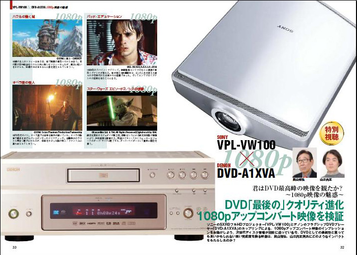 DVDがハイビジョンディスクに変わる!? デノンのDVD-A1XVAは1080p出力が可能なDVDプレーヤーです。この潜在能力を活かせるディスプレイを接続すれば、まさに夢世界。ここではソニーのSXRDプロジェクター・VPL-VW100と組み合わせ、『ハウルの動く城』『バッド・エデュケーション』『オペラ座の怪人』『スター・ウォーズ エピソード3/シスの復讐』のDVDをテストソースとして映像感をレポートしています。 <第1特集> トリノオリンピックをフル装備で大画面観戦!