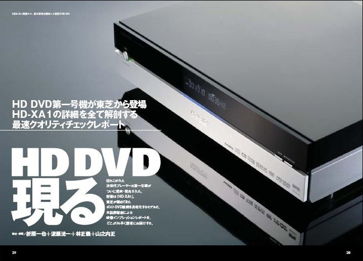 皆さん、既にご存知かと思いますが、遂にHD DVDプレーヤーが発売されました。東芝のHD-XA1です。4月27日までに購入すれば、『バイオハザード』『ムーンライト・ジェリーフィッシュ』のHD DVDソフトが付いてきます。一方、市販ソフトはポニーキャニオンからHD DVDとDVDを収録するツインフォーマット版が3タイトル発売されました。その他数タイトルの発売が確定し、年内には150〜200タイトルが揃うと見込まれています。まさに締め切り間際、ファーストインプレッションをお届けしました。その他、連載の「市川二朗のしあわせ劇場」でもこのHD-XA1を6ページで紹介しています! <総力特集> ドイツW杯はこれで万全!